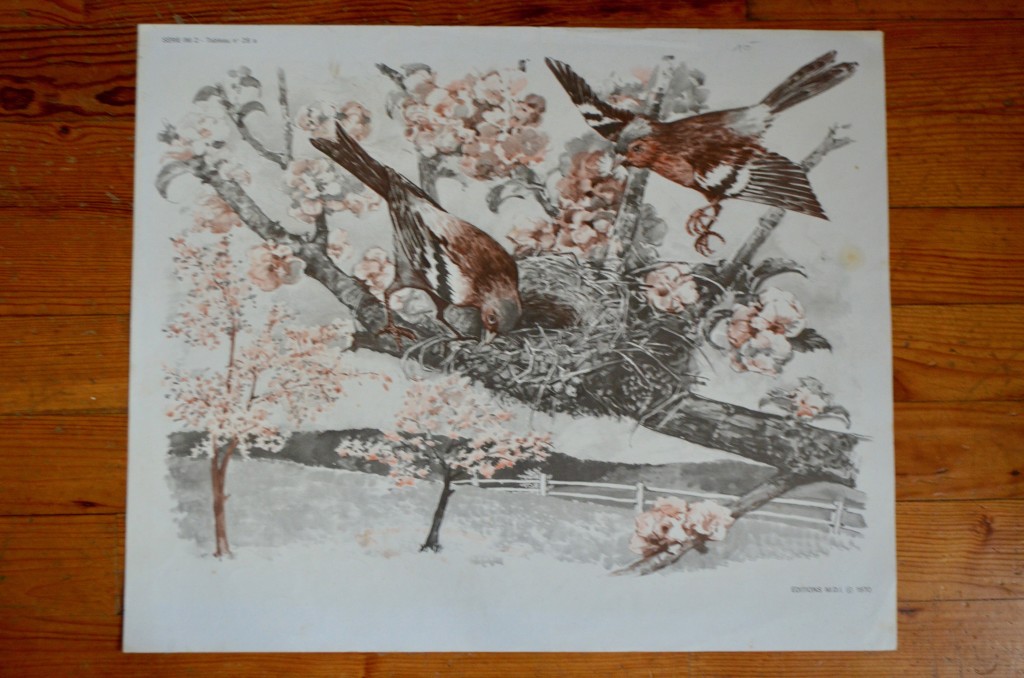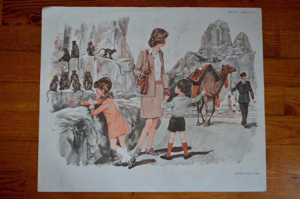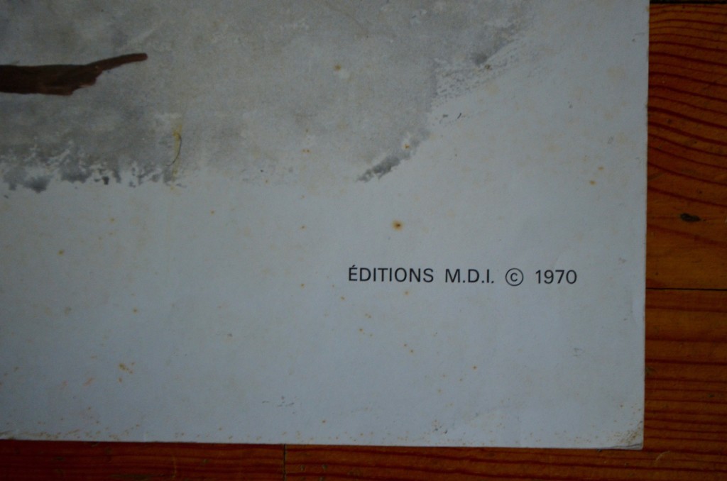 Les affiches éditées par MDI (Maison Des Instituteurs) en 1970 sont en papier cartonné épais. Les couleurs sont encore très belles et les dessins très originaux. L’état est correct, de légères déchirures discrètes peuvent marquer les affiches mais aucun manque n’est à noter. Une illustration différente est présente au recto et au verso. Nous disposons de nombreux modèles de ces séries.